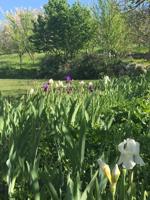 Almond and cherry behind the iris bed….